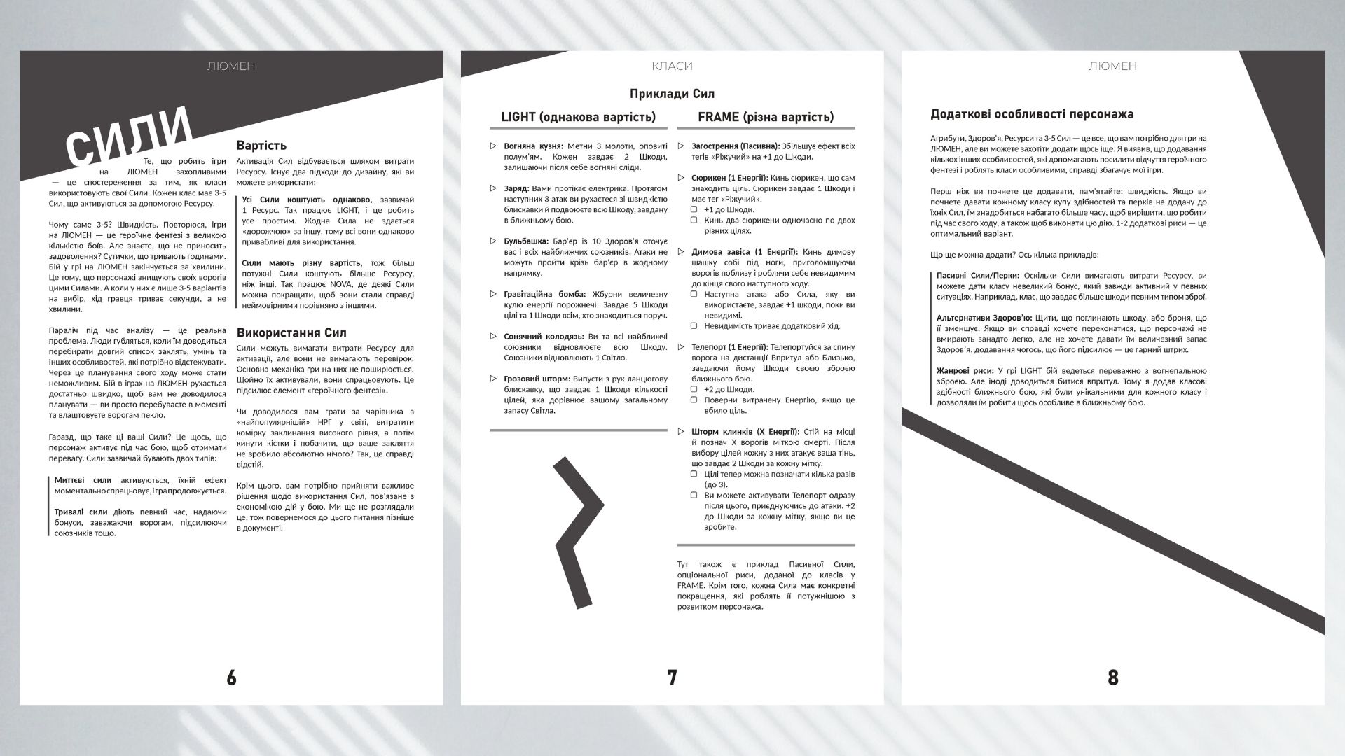 ЛЮМЕН (LUMEN SRD) — настільна рольова система, створена для динамічних та яскравих пригод. Вона поєднує швидкий механізм кидків кісток, гнучкість у створенні персонажів та бої, що дарують відчуття справжньої напруги. Якщо ви прагнете створити гру, де персонажі стануть непереможними героями, і де кожен хід відчувається значущим — ЛЮМЕН стане ідеальним інструментом для вас.